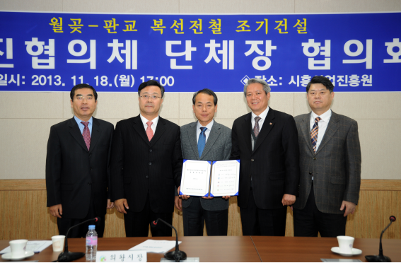 시흥시(시장 김윤식)를 비롯한 성남, 안양, 광명, 의왕 5개 지방자치단체 장은 지난 18일 시흥산업진흥원(경기도 시흥시 정왕동 소재)에서 월곶-판교 복선전철의 조기건설을 위한 대응 및 향후 추진방안에 대하여 논의하고 해당 시민들의 뜻을 담은 공동건의문을 작성했다.