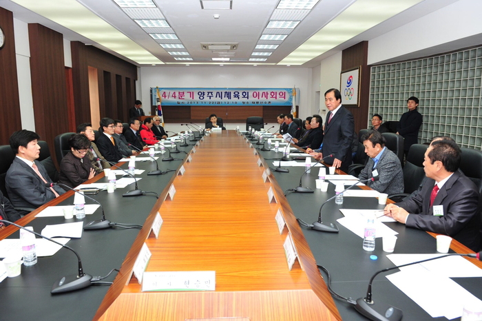 현삼식 양주시장을 비롯한 체육회 이사, 감사 50여명이 참석한 가운데 열린 이번 회의는 4/4분기 생활체육회 사업과 각종 대회의 결과보고를 진행하고 직장운동경기부 및 학교체육 활동 현황에 대한 보고와 기타 질의응답 시간을 가졌다.