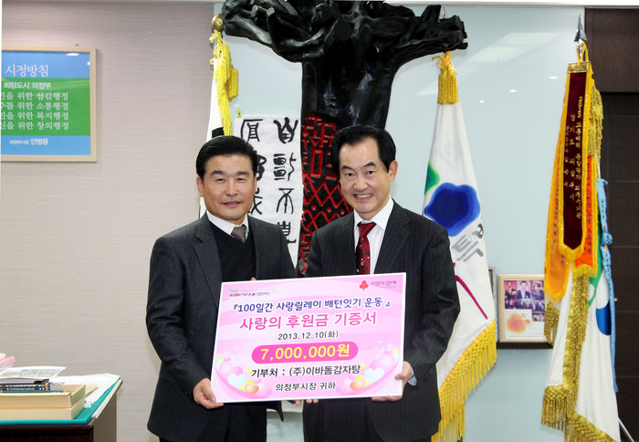 지난 10일, ㈜이바돔(대표 김현호) 관계자들은 “100일간 사랑릴레이 배턴잇기 운동”에 참여하기 위해 의정부시(시장 안병용)를 방문하였다.