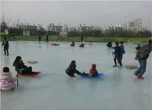 시흥시 정왕동 도심 속에 얼음썰매를 즐길 수 있는 얼음썰매장이 문을 열어 지역 주민들에게 큰 인기를 누리고 있다.