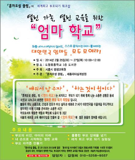 시흥시(시장 김윤식)가 지난 2012년부터 관내 초등학교 1학년 학부모를 대상으로 개최하고 있는 ‘강희맹의 훈자오설 학부모 아카데미’ 수료생들이 오는 25일부터 27까지 3일간 도창초등학교에서 <엄마학교> 수업을 연다.
