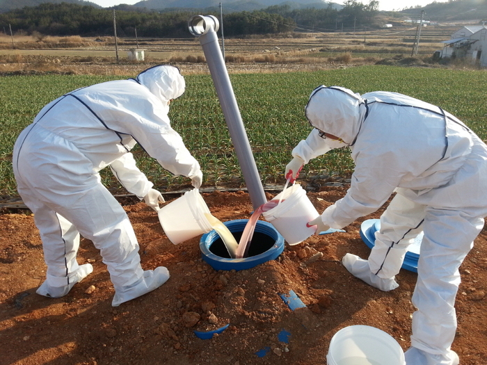 해남군(군수 박철환)이 고병원성 AI 발생관련 살처분 매몰에 유용미생물을 활용해 악취를 완화시키며 주민 호응을 받고 있다.