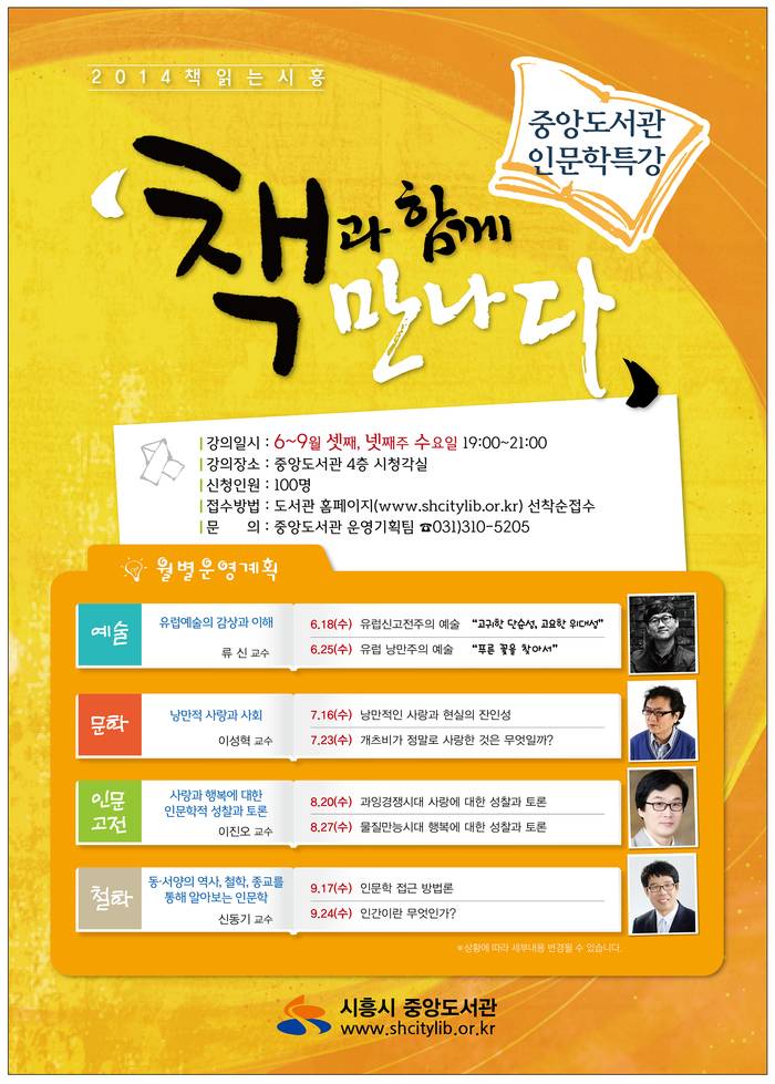 각 분야별 전문가 강연으로 진행되는 ‘책과 함께 만나다’ 인문학 강좌는 매월 셋째, 넷째 주 수요일 저녁 7시에 중앙도서관 시청각실에서 열리며, 중앙도서관 홈페이지(www.shcitylib.or.kr)를 통해 선착순으로 신청 가능하다. 매월 운영되는 인문학 강좌 세부내용은 도서관 홈페이지를 통해 확인할 수 있다.