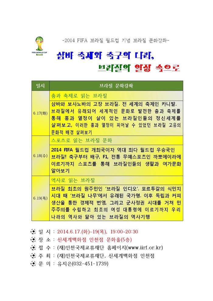 2014 FIFA 브라질 월드컵을 맞이하여 (재)인천국제교류재단과 신세계백화점 인천점이 공동으로 브라질 문화강좌를 개최한다.