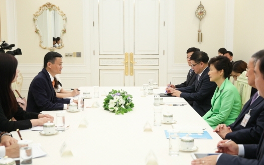 박근혜 대통령은 18일 오후, 세계 최대의 온라인 업체인 알리바바(Alibaba) 그룹의 ‘마윈(馬云)’ 회장과 접견해 양국 간 전자상거래, 게임·영화·방송 등 디지털콘텐츠 협력에 관해 의견을 교환했다.