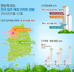국토교통부는 전국 입주예정 아파트는 총 67,426세대(10~12월, 조합 물량 제외)로 집계됐으며, 지역별로는 수도권 20,756세대(서울 3,566세대 포함), 지방 46,670세대가 각각 입주되는 것으로 조사됐다고 밝혔다.