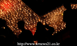 2014년 10월 9일, 독일 동부의 라이프치히에 있는 아우구스트 광장에서 사람들이 베를린 장벽 붕괴 25주년을 기념하기 위해 촛불을 밝히고 있다.