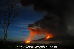 인도네시아 수마트라섬, 카로 지역의 시나붕 산이 폭발하면서 발생한 그을린 용암과 거대한 화산재 구름의 모습. 2014년 10월 9일 사진.