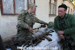 우크라이나인 군인이 2014년 10월 11일 우크라이나 동쪽 루간스크(Lugansk)지역의 Schastya마을 근처에서 경비를 서고 있다.