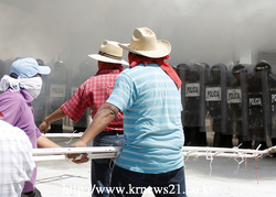 멕시코 교사들이 이달 초 불량 경찰의 공격으로 행방불명된 43명의 학생들의 귀환을 요구하는 시위 도중 폭동진압경찰들과 2014년 10월 13일, 멕시코 칠판싱고(Chilpancingo)에 있는 게레로(Guerrero)주(州) 의회 앞에서 충돌했다.