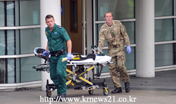 2014년 10월 13일, 잉글랜드 북서부의 리버풀(Liverpool)에 있는 Royal Liverpool 병원 밖에서 군인들이 응급구조요원이 탄 앰뷸런스와 함께 돌아오고 있다.