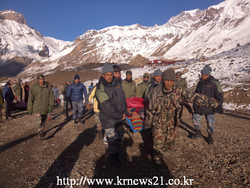 2014년 10월 15일 네팔 군대에 의해 공개된, 네팔 마낭(Manang) 지역의 안나프루나 라운딩 코스에서 발생한 눈보라로 부상당한 생존자들이 네팔 군인들의 도움을 받고있는 모습.