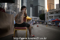 2014년 10월 16일, 홍콩의 한 민주화시위자가 어드미럴티 지구 입구에 있는 바리케이트 근처에 앉아있다.