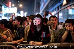 2014년 10월 19일 홍콩의 몽콕 지구에서 한 민주화 시위자가 가이 폭스(Guy Fawkes)*가면을 쓴채 경찰과 떨어져 바리케이트쪽에 서 있다.
