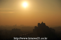 2014년 10월 30일, 스모그현상이 나타난 벨라루스의 수도 민스크(Minsk)에서 해가 떠오르는 모습.