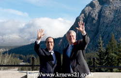 프랑수와 올랑드(Francois Hollande) 프랑스 대통령과 스티븐 하퍼(Stephen Harper) 캐나다 총리가 2014년 11월 2일, 캐나다 앨버타(Alberta)의 밴프(Banff)에 있는 페어몬트 호텔악수를 하고 있다.
