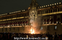 2014년 11월 8일, 시위자들이 43명의 실종학생들의 대학살에 대한 멕시코정부의 '정의'를 요구하며 멕시코시티의 국립왕궁의 입구에 불을 질렀다.