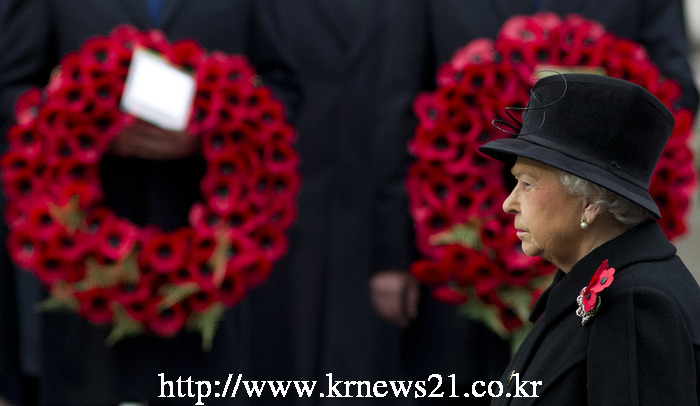 2014년 11월 9일, 영국 여왕 엘리자베스 2세가 런던 화이트홀에 있는 기념비 앞에서 제 1,2차 세계 대전 전사자 추도일 행사를 이끌고 있다.