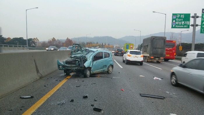 11일 오후 5시경 외곽 순환도로 서하남 IC근처에서 ㅇㅇ차량이 출구를 놓쳐 2차선에서 4차선으로 급차선 변경중 스파크 차량에게 영향을줘 스파크 차량 중심을 잃고 중앙 분리대와 충돌했다.