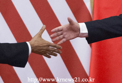 버락 오바마 미국 대통령(왼쪽)과 중국 시진핑 주석(오른쪽)이 2014년 11월 12일, 베이징 인민대회당에서 열린 양자회담을 마치고 악수하는 모습. 오바마 대통령은 APEC 정상회담이 끝나고 하루 일정으로 중국에 머물렀다.