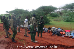 2014년 11월 22일, 케냐 보안군이 새벽에 있었던 버스 공격으로 사망한 희생자들 옆에 서 있다. Shebab이란 이름의 소말리아 이슬람 무장세력은 소말리아와 인접한 케냐 국경 인근의 Mandera의 마을에서 50km정도 떨어진 지점에서 버스에 탄 승객 중 비이슬람 승객 28명을 골라내 처형했다.