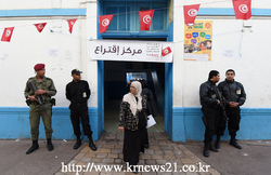 2014년 11월 23일, 2011년 혁명 이후 첫 대통령 선거 기간 동안 튀니지 보안군이 수도 튀니스 중심부의 투표소 밖에서 경비를 서고 있다. 27명의 후보 중 가장 유력한 후보로는 87세의 세속주의 성향인 니다 투니스 당의 에셉시(Essebsi)후보이다.