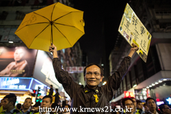 2014년 11월 26일, 홍콩의 민주화시위자가 몽콕 지구에서 플래카드와 노란우산을 든 채 경찰들 앞에 서 있다. 수백명의 홍콩 경찰이 26일(현지시간) 민주화 시위 캠프를 철거하고 학생시위 대표인 조슈아 웡 등 지도부들을 체포하고 거의 2달간 막혀있던 메인도로를 다시 열었다.