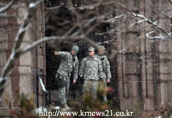 2014년 11월 26일, 미 방위군들이 미국 미주리 주 세인트루이스 시청에서 경계를 서고 있다. 비무장상태의 흑인소년을 총으로 쏴 사살한 백인경관을 기소하지 않겠다는 대배심의 결정에 항의하는 시위가 미국 전역에 이틀째 계속되고 있다.