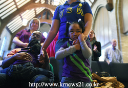 2014년 11월 27일(현지시간), 미국 미주리주 퍼거슨의 한 교회에서 사람들이 추수감사절 예배 도중 기도를 하고 있다. 미주리 대배심이 지난 8월 9일, 18세의 흑인소년 마이클 브라운을 총으로 쏴 숨지게 한 백인 경찰 대런 윌슨을 기소하지 않겠다는 결정을 내린 이후 퍼거슨시는 폭력적 시위가 진행되어 왔다.