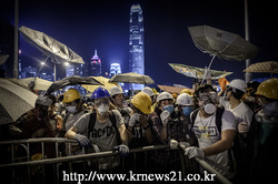 2014년 11월 30일, 홍콩 민주화시위자들이 어드미럴티 지구에서 민주화 시위 도중 경찰과의 충돌에 맞서고 있다. 시위자들은 2017년 홍콩의 행정장관 선거에 중국이 친중국계 인사만 입후보할수있는 제한을 두자 이에 대항해 자유선거를 요구하고 있다.