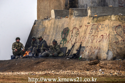 2014년 12월 1일, 터키 병사들이 시리아와 접경지역인 무르시트피나르 국경에서 모닥불 주변에 모여있다. 시리아 코바니를 차지하기 위한 IS 세력은 미국이 이끄는 공습으로 인한 전투로 인해 꽤 많은 손실을 받은 것으로 소식통이 전했다. 최소 50명의 IS 병사가 궁지에 몰린 국경 마을에서의 자살폭탄테러, 코바니의 쿠르드족 수비대, 공습으로 인해 사망했다고 시리아인 인권 전망대가 밝혔다.
