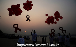 2014년 12월 1일, 인도 콜카타에서 세계 에이즈의 날 행사가 열리는 동안 인도인 사회 활동가들과 아이들이 리본과 풍선을 날려보내고 있다. UN 에이즈 프로그램에 따르면 인도는 2013년 말, 세계에서 에이즈 감염자가 3번째로 많은 국가이며 아시아-태평양 지역에서 에이즈로 인한 사망자의 절반 이상이 인도인이다.