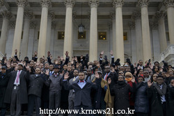 아프리카계 미국인 의원들이 2014년 12월 11일, 미국 워싱턴DC의 캐피톨 힐의 하원의회 건물 앞에서 파업 도중 손을 잡고 들어올리고 있다. 의원들과 그 외의 참가자들은 의회 앞에서 에릭가너와 마이크 브라운 사건의 백인 경관을 불기소 하겠다는 대배심의 결정에 항의 시위를 벌였다.