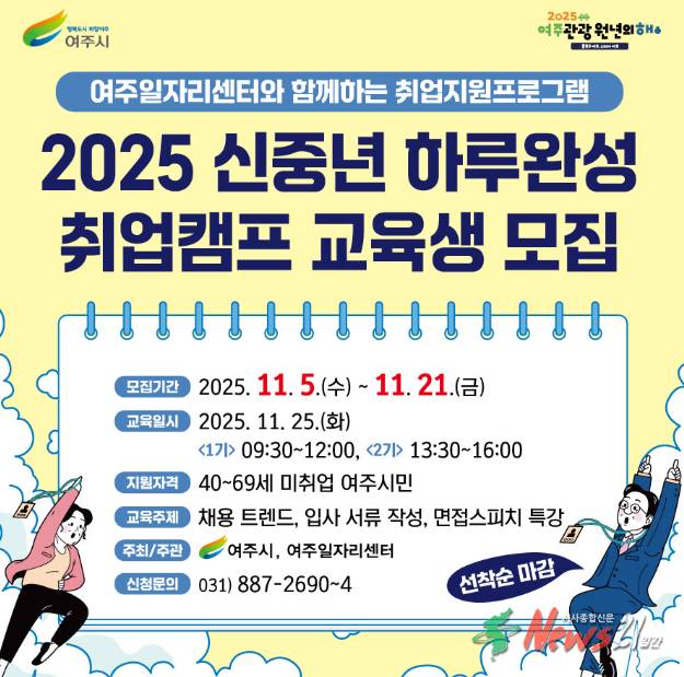여주시는 오는 11월 25일 여주일자리센터에서 관내 40세부터 69세 미취업자 20명을 대상으로 ‘2025 신중년 하루 완성 취업캠프’를 운영한다. 이번 교육은 채용 경향, 입사서류 작성법, 면접 스피치 등 실무 중심의 150분 프로그램으로 교육생은 구직 준비 전반에 필요한 핵심 내용을 하루 동안 배울 수 있다. 교육 참여 신청 기간은 11월 ...