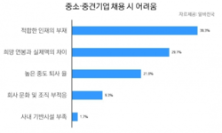 또한 ‘희망 연봉과 지급 가능 연봉액의 차이’(29.7%)와 ‘높은 중도 퇴사 율’(21.0%) 역시 높은 수치로 각각 2,3위에 오르며 채용의 주요 애로사항으로 꼽혔다. 그밖에 4위 ‘회사 문화 및 조직 시스템에 부적응’(9.3%), 5위 ‘신규 입사자를 위한 사내 기반시설 부족’(1.7%)이 뒤를 이었다.