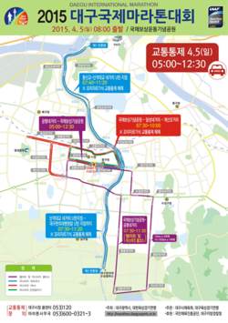 2015대구국제마라톤대회가 열리는 4월 5일(일) 오전 05:30∼12:30까지 시내버스 72개 노선 982대가 마라톤 코스를 우회하여 운행하거나, 선수들이 주행하는 통제시간 동안 교차지점에서 대기한 후 통과하게 된다.