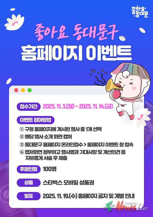 서울 동대문구(구청장 이필형)는 구 누리집에 게시된 각종 행사 콘텐츠에 대한 주민들의 관심을 높이고, 실질적인 의견을 수렴하기 위해 ‘주민 참여 이벤트’를 실시한다.     이번 이벤트는 구 누리집에 소개된 다양한 행사 중 관심 있는 한 가지를 선택해 의견을 자유롭게 제안하는 방식으로 진행된다. 참여 기간은 11월 3일부터 14일까지이...