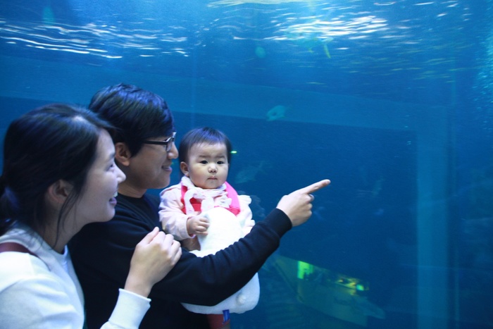 3천여 마리의 해양생물들이 유영하는 메인수조 앞에서 사랑하는 가족에게