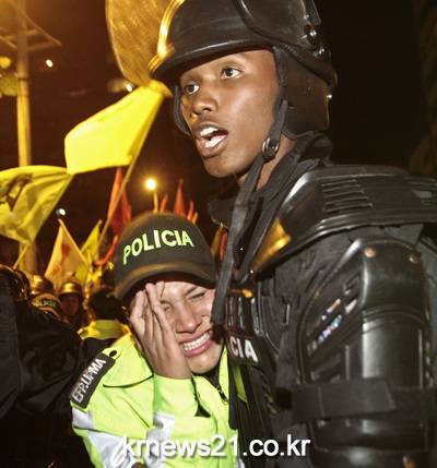 에콰도르 수도 키토에서 라파엘 코레아 대통령의 상속세 인상 법안을 발표한 후 이에 반대하는 시위가 벌어져 시위대와 충돌한 경찰이 부상을 당해 부축을 받고 있다.