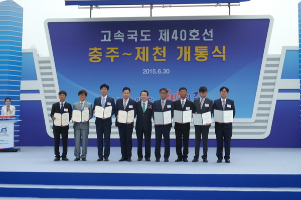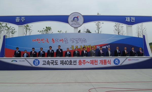 ▲ 한국도로공사는 30일 충주시 산척면 동서고속도로 천등산휴게소에서 제천∼동충주 구간 개통식을 했다.