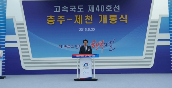 ▲ 30일 이근규 충북 제천시장이 제천~충주 동서고속도로 개통식 기념 축사를 하고 있다.