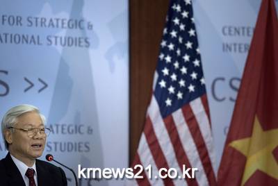 ▲ 베트남의 응우옌 푸 쫑 서기장이 베트남전쟁 50주년 맞이 연설을 하고 있다. ⓒAFP베트남의 응우옌 푸 쫑 서기장이 미국 워싱턴 DC의 국제전략연구센터에서 베트남전쟁 50주년 기념 식에서 연설하고 있다.
