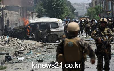 아프가니스탄 수도 카불에서 북대서양조약기구인 NATO 군을 겨냥한 무장세력의 폭발 사고로 NATO군 차량이 불에 타고 있다.