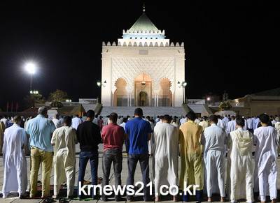 ▲ 모로코에서 라마단 기간 중 무슬림 남성들이 기도를 올리고 있다. ⓒAFP모로코 수도 라바트에서 이슬람 성월인 라마단 기간에 금식이 진행되는 동안 무슬림 남성들이 기도를 올리고 있다.