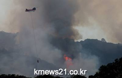 ▲ 미국 캘리포니아주 베리에사호 인근 산에서 화재로 24,000㎡가 전소되었다. ⓒAFP미국 캘리포니아주 베리에사호 인근 산에서 화재 발생으로 헬리콥터가 화재 진압을 하고 있다.