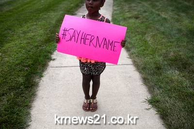 ▲ 미국서 수감 중이던 여성의 갑작스러운 죽음에 대한 수사에 관심이 커지고 있다. ⓒAFP미국 일리노이주 라일의 한 교회에서 열린 샌드라 블랜드의 장례식장 앞에서 5세 소녀가 팻말을 들고 서있다.