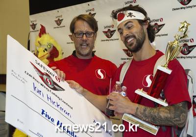 ▲ 미국에서 치킨의 날을 맞이해 5분안에 26개 닭 날개를 먹고 우승한 32세 이안 알링턴 ⓒAFP미국 워싱턴 D.C.에 위치한 세이프웨이 마트에서 치킨의 날을 맞이해 5분안에 26개의 치킨 날개를 먹고 우승한 32세 이안 히크만이 상금과 트로피를 들고 기뻐하고 있다.