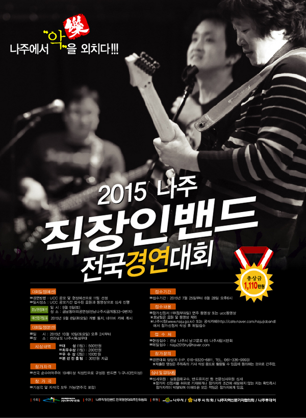 나주사랑시민회와 2015나주직장인밴드 전국경연대회추진위원회가 공동 주관하는 전국직장인밴드경연대회가 10월 10일 오후 2시 나주시 특설무대 (대호수변공원)에서 열린다.