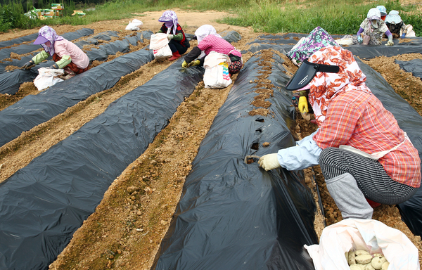18일 전남 함평군 함평읍 장교리 한 들판에서 아낙들이 가을감자를 식재하고 있다.