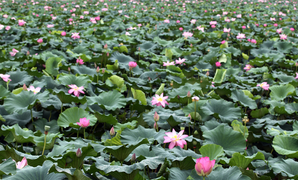 무더위를 식히는 비가 내린 20일 전남 함평군 함평읍 진양리 한 저수지에서 연꽃이 빗속에서 요염한 자태를 뽐내고 있다.